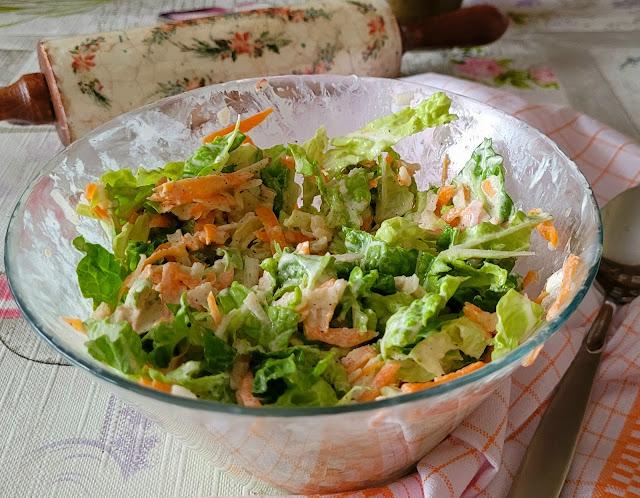 Prosta surówka do obiadu z kilku świeżych warzyw polanych odrobiną jogurtu, oliwą i sokiem z cytryny.